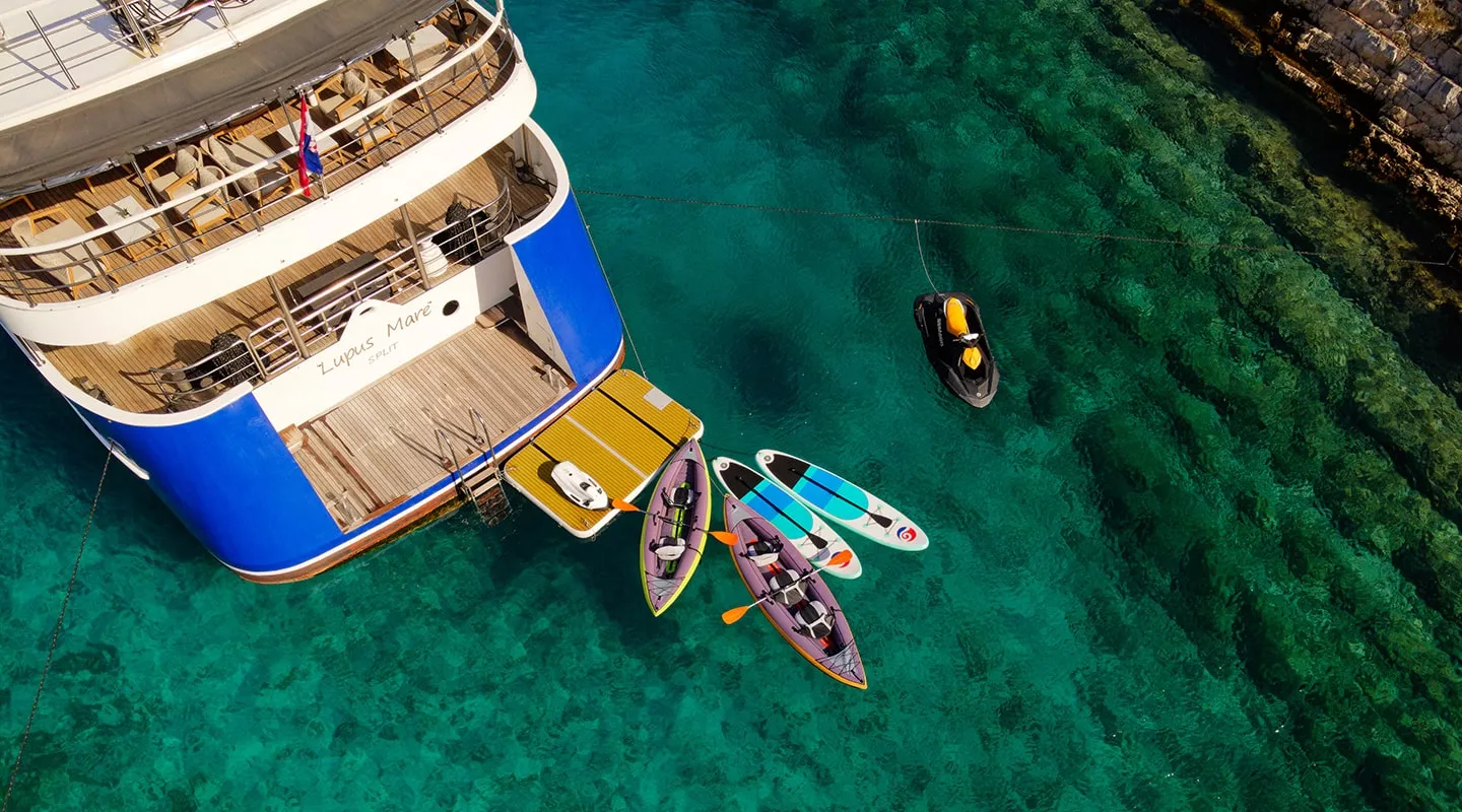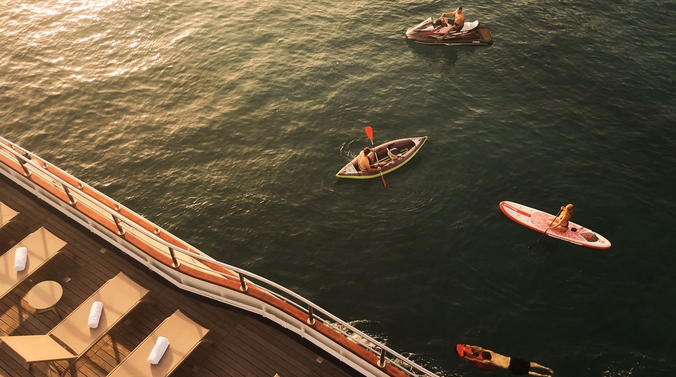 Playtime, unlocked: Paddleboards, Seabobs, snorkels, kayaks, floaties—and a tender to chase the shore.